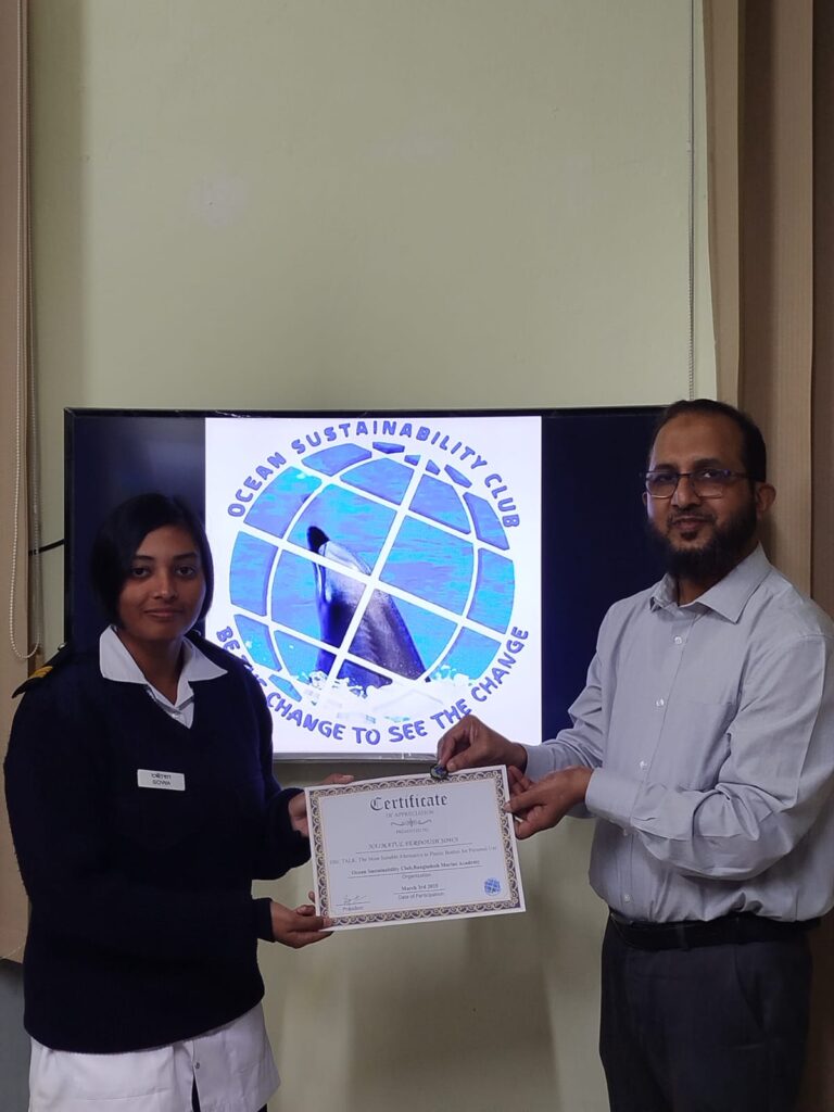 Certificates of Recognition were formally awarded by Mohammed Abdul Awal, Joint Secretary of the Ministry of Shipping Bangladesh, in appreciation of the cadets’ meaningful efforts to promote ocean protection and sustainability within the Academy community. His presence added special significance to the occasion and reinforced the importance of youth leadership in shaping a responsible and forward-looking maritime sector.
